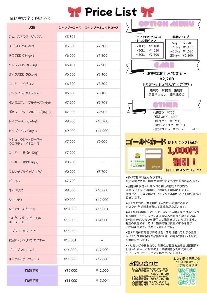 なお、トリミング料金につきましては、4月1日以降のご予約分より新価格を適用からさせていただきます。
